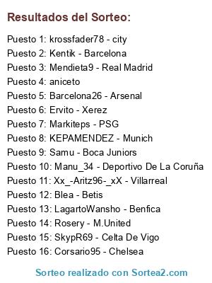 Lista de participantes: Mendieta9 - Real Madrid, Xx_-Aritz96-_xX - Villarreal, Blea - Betis, Rosery - M.United, Markiteps - PSG, SkypR69 - Celta De Vigo, Kentik - Barcelona, Ervito - Xerez, krossfader78 - city, KEPAMENDEZ - Munich, Manu_34 - Deportivo De La Coruña, LagartoWansho - Benfica, Samu - Boca Juniors, Barcelona26 - Arsenal, Corsario95 - Chelsea, aniceto.