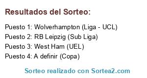 Lista de participantes: Wolverhampton (Liga - UCL), RB Leipzig (Sub Liga), West Ham (UEL), A definir (Copa).
