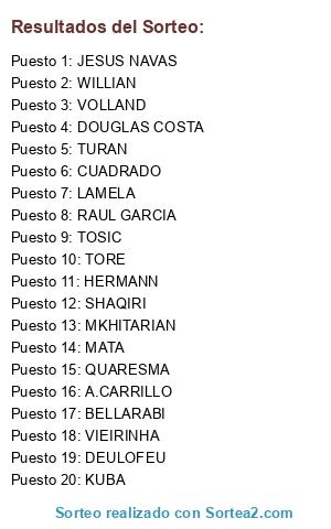 Lista de participantes: MATA, TURAN, DOUGLAS COSTA, MKHITARIAN, WILLIAN, CUADRADO, BELLARABI, RAUL GARCIA, HERMANN, QUARESMA, TOSIC, JESUS NAVAS, LAMELA, VIEIRINHA, TORE, SHAQIRI, VOLLAND, DEULOFEU, KUBA, A.CARRILLO.