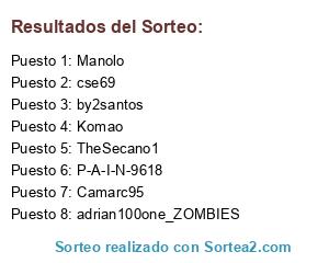 Lista de participantes: sanchoalag96, NauK, Shaded, Dj Capa, CrisstHD, bugma, Komao, Camarc95, ferdjpark, n182_182, pablillo_zgz, DanWork, eny96, siffty, Yepes, pelicano_02, Scorpion_atm, Alvaaroo16, PUPOXX, alvaricoo, NeloX, by2santos, GoyoKalebadBO, Gornes_B, Rama, Sema, GDH6200, cse69, Manolo, Malagueño, iRomero, shaq77, SleepingCuriosity, Dani_C, LosT-rivaaS, oriolfb, enric1998, Kiamasu, Spacer, Jokinzazpi, saku127, adrian100one_ZOMBIES, Opforen, Deidara_Uchiha, aspicientis, Supermantxitos, TheRuGaR, Mesuz, Ooskitar, belko2, TheSecano1, andz, javip136, iMpAcT_FeAr, Kerochan, abel123s, Yillen, xRaii, P-A-I-N-9618, .Ninjita, playmasterhd, DeViiL, Anonymo-_-, Nameless.