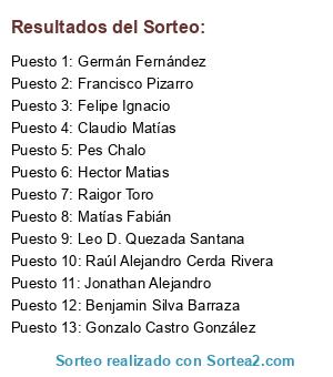 Lista de participantes: Felipe Ignacio, Matías Fabián, Jonathan Alejandro, Pes Chalo, Hector Matias, Germán Fernández, Gonzalo Castro González, Raigor Toro, Raúl Alejandro Cerda Rivera, Leo D. Quezada Santana, Francisco Pizarro, Benjamin Silva Barraza, Claudio Matías.