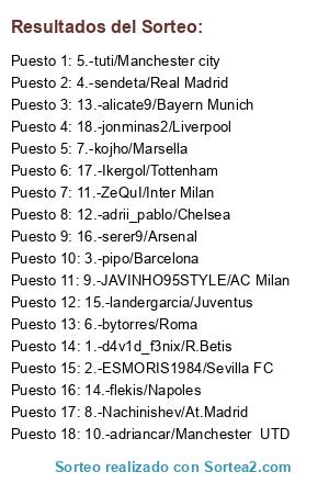 Lista de participantes: 1.-d4v1d_f3nix/R.Betis, 2.-ESMORIS1984/Sevilla FC, 3.-pipo/Barcelona, 4.-sendeta/Real Madrid, 5.-tuti/Manchester city, 6.-bytorres/Roma, 7.-kojho/Marsella, 8.-Nachinishev/At.Madrid, 9.-JAVINHO95STYLE/AC Milan, 10.-adriancar/Manchester UTD, 11.-ZeQuI/Inter Milan, 12.-adrii_pablo/Chelsea, 13.-alicate9/Bayern Munich, 14.-flekis/Napoles, 15.-landergarcia/Juventus, 16.-serer9/Arsenal, 17.-Ikergol/Tottenham, 18.-jonminas2/Liverpool.