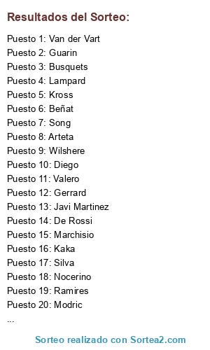 Lista de participantes: Xavi, Silva, Pirlo, Fabregas, Ozil, X.Alonso, Schweinsteiger, De Rossi, Mata, Modric, Yaya Toure, Boateng, Hamsik, Van der Vart, Nasri, Busquets, Vidal, Marchisio, Moutinho, Kaka, Gotze, Cazorla, Miccoli, Gerrard, Muller, Kross, Song, Nocerino, Diego, Lampard, Ramires, Hernanes, Javi Martinez, Fellaini, Tiote, Zanetti, Wilshere, Guarin, Arteta, Valero, Beñat, Gundogan, Dembele, Gustavo.