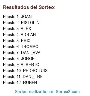 Lista de participantes: ALEX, JORGE, ALBERTO, RUBEN, PEDRO LUIS, ADRIAN, DANI_TRF, TROMPO, PISTOLIN, DANI_VVA, ERIC, JOAN.