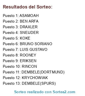 Lista de participantes: ERIKSEN, BRUNO SORIANO, RINCON, KOKE, SNEIJDER, BEN ARFA, DRAXLER, ROONEY, LUIS GUSTAVO, KRYCHOWIAK, DEMBELE(DORTMUND), DEMBELE(SPURS), ASAMOAH.