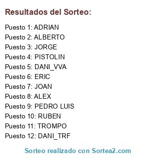 Lista de participantes: ALEX, JORGE, ALBERTO, RUBEN, PEDRO LUIS, ADRIAN, DANI_TRF, TROMPO, PISTOLIN, DANI_VVA, ERIC, JOAN.