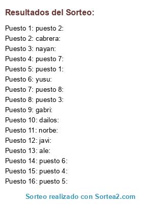 Lista de participantes: ale:, norbe:, javi:, dailos:, gabri:, nayan:, yusu:, cabrera:, puesto 1:, puesto 2:, puesto 3:, puesto 4:, puesto 5:, puesto 6:, puesto 7:, puesto 8:.