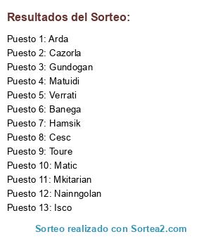 Lista de participantes: Mkitarian, Cazorla, Nainngolan, Hamsik, Cesc, Matuidi, Verrati, Gundogan, Matic, Toure, Isco, Banega, Arda.
