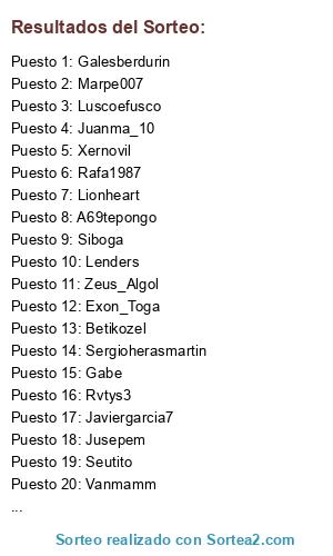 Lista de participantes: Vanmamm, Marpe007, Maza11, Perello, Xernovil, Chisnieto, Rvtys3, Andoni, Xxgutixx, Javiergarcia7, Juanma_10, Zenitramm, Luscoefusco, Tarzandelpro, Exon_Toga, Zeus_Algol, Lionheart, Sergioherasmartin, Siboga, Jusepem, Estupeyonk, Seutito, Lenders, Gorri7, Davies19951995, El_Sucre, A69tepongo, Esancho, Jparram, Gabe, Betikozel, Franmeister, Galesberdurin, Rafa1987, Zanarkanz, Saxoman.