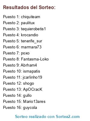 Lista de participantes: marmara73, Abrham4, Fantasma-Loko, tequierobetis1, tenerife_sur, poxo, jcarlinho19, guycola, shogo, paulitux, chiquiteam, ismapatis, krocandio, gullo, Mario13ares, ApOCracK.