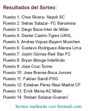 Lista de participantes: Esteban Pérez-Real Madrid CF, Jose Cruz-Torino, Andres Viquez-Bayern Munchen, Jose Brenes-Boca Juniors, Erick Mena-AC Milán, Chus Rivera- Napoli SC, Dexter Castro-Tigres UANL, Steban Salazar-Guaraní, Gustavo Rodriguez-Alianza Lima, Sebas Salazar- FC Barcelona, Diego Baca-Inter de Milán, Jostin Gómez-Red Star FC, Bryan Monge-Indefinido, Fabían Sandí-PSG.