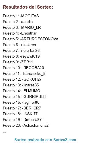 Lista de participantes: -lagmor80, -INSKI77, -linares35, -EDU_MB1, -irizar, -ralalarcn, -ignaciovp, -Enosthar, -aandia, -NENECR7, -nefertari26, -EHB_KIKE, -RECOBA20, -soylaguia, -ELMUMO, -ELOSKARON, -GURRIPULLI, -MOGITAS, -ZER11, -ARTUROESTONOVA, -reywwf619, -franciskiko_8, -BER_CR7, -GOKUH27, -Roberto_69_89, -Achachancha2, -calcetines, -Dmolina87, -victor89, -MARIO_LR.