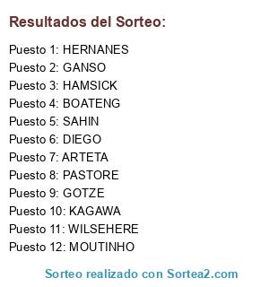 Lista de participantes: ARTETA, SAHIN, WILSEHERE, PASTORE, DIEGO, GANSO, MOUTINHO, GOTZE, HAMSICK, HERNANES, BOATENG, KAGAWA.