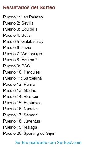 Lista de participantes: Alcorcon, Roma, Sabadell, Barcelona, Galatasaray, Hercules, Juventus, Malaga, Lazio, Betis, Espanyol, Madrid, Sevilla, Napoles, Sporting de Gijon, PSG, Wolfsburgo, Las Palmas, Equipo 1, Equipo 2.