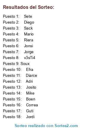 Lista de participantes: Soux, v3sTi4, Jonsi, Josito, Efra, Sete, Diarce, Diego, Correa, Riera, Sack, Boen, Mike, Jordi, Mario, Adri, Guti, Jorge.