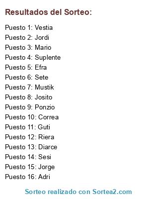 Lista de participantes: Adri, Mario, Jorge, Suplente, Jordi, Guti, Diarce, Sete, Mustik, Sesi, Riera, Vestia, Josito, Correa, Ponzio, Efra.