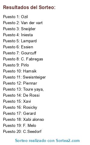 Lista de participantes: Xabi alonso, Toure yaya,, Gerard, F. Melo, C.Seedorf, Iniesta, C. Fabregas, Ozil, Sneijder, Xavi, De Rossi, Sweisnteiger, Essien, Gourcuff, Lampard, Hamsik, Van der vart, Rosicky, Piennar, Pirlo.