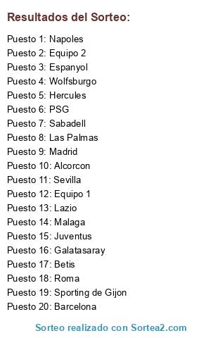 Lista de participantes: Alcorcon, Roma, Sabadell, Barcelona, Galatasaray, Hercules, Juventus, Malaga, Lazio, Betis, Espanyol, Madrid, Sevilla, Napoles, Sporting de Gijon, PSG, Wolfsburgo, La Palmas, Equipo 1, Equipo 2.