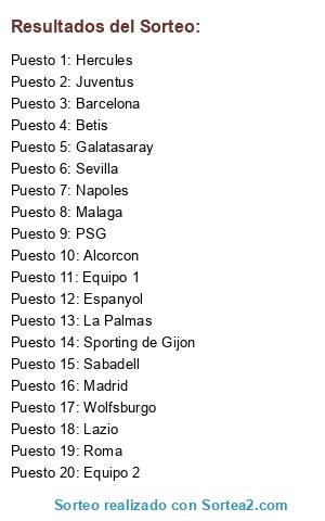 Lista de participantes: Alcorcon, Roma, Sabadell, Barcelona, Galatasaray, Hercules, Juventus, Malaga, Lazio, Betis, Espanyol, Madrid, Sevilla, Napoles, Sporting de Gijon, PSG, Wolfsburgo, La Palmas, Equipo 1, Equipo 2.