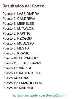 Lista de participantes: RAKITIC, SRNA, VIROTA, MESTO, M.TAYLOR, MANNINI, MODESTO, JESUS NAVAS, EMANUELSON, NZOGBIA, KRASIC, CANDREVA, LASS DIARRA, MEIRELES, FERNANDES, KADER KEITA.
