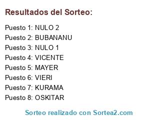 Lista de participantes: BUBANANU, KURAMA, MAYER, VICENTE, VIERI, OSKITAR, NULO 1, NULO 2.