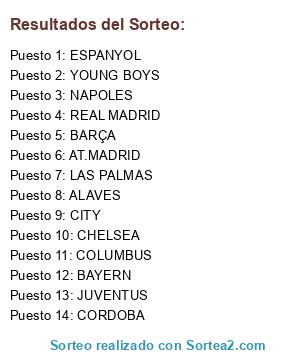 Lista de participantes: AT.MADRID, BAYERN, YOUNG BOYS, CHELSEA, COLUMBUS, CORDOBA, ALAVES, BARÇA, JUVENTUS, CITY, NAPOLES, ESPANYOL, REAL MADRID, LAS PALMAS.