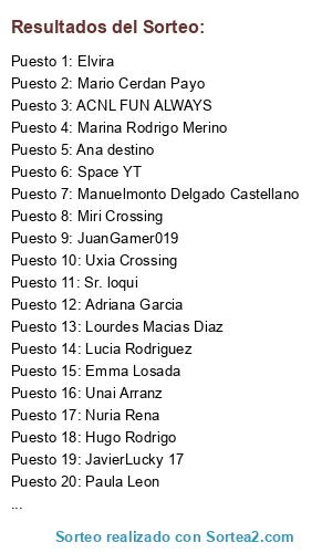 Lista de participantes: Ana destino(3 participaciones), Paula Leon, JuanGamer019(2 participaciones), Miri Crossing(3 participaciones), Sr. loqui(5 participaciones), Space YT(3 participaciones), Manuelmonto Delgado Castellano(3 participaciones), Emma Losada(3 participaciones), Lucia Rodriguez(3 participaciones), Unai Arranz, Lourdes Macias Diaz, Elvira(21 participaciones), Uxia Crossing(3 participaciones), Marina Rodrigo Merino, ACNL FUN ALWAYS(9 participaciones), JavierLucky 17, Adriana Garcia(2 participaciones), Mario Cerdan Payo, Hugo Rodrigo, Nuria Rena, FRANCINA T.V., Kurumi Toka.