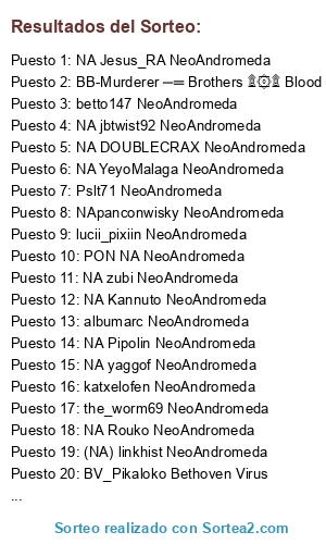 Lista de participantes: NA zubi NeoAndromeda, RLP_Sephir ~~El Rincon De la Perla~~, nokee NeoAndromeda, (NA) linkhist NeoAndromeda, NA Skaramuze NeoAndromeda, rpalmie1, ARenCer NeoAndromeda, Pslt71 NeoAndromeda, NA yaggof NeoAndromeda, NA OKperdon NeoAndromeda, katxelofen NeoAndromeda, PON NA NeoAndromeda, albumarc NeoAndromeda, NA Fujitsu NeoAndromeda, NA YeyoMalaga NeoAndromeda, (TCA)xxguruxx Time Conquers All, -tEfo-NA21- NeoAndromeda, jannuvic NeoAndromeda, NA Reia19 NeoAndromeda, NA Avila NeoAndromeda, betto147 NeoAndromeda, NA Gaf3 NeoAndromeda, the_worm69 NeoAndromeda, NA - Rgslz NeoAndromeda, NA Jesus_RA NeoAndromeda, NA Rouko NeoAndromeda, estebanhuelva Game Over, NApanconwisky NeoAndromeda, 0 Pretorian Bethoven Virus, bff NeoAndromeda, (NA)Antoni NeoAndromeda, NA DOUBLECRAX NeoAndromeda, NA jbtwist92 NeoAndromeda, mastter1, NA Luisico NeoAndromeda, NA Kannuto NeoAndromeda, aquariusCamusJ NeoAndromeda, (NA) kame5 NeoAndromeda, DI-Necros DRAGONES IBEROS, LUPER994 NeoAndromeda, Mayu690 NeoAndromeda, NA Pipolin NeoAndromeda, NA Lashillo NeoAndromeda, BV_Pikaloko Bethoven Virus, BB-Murderer ─═ Brothers ۩۞۩ Blood ═─, lucii_pixiin NeoAndromeda, Scamot Catala NeoAndromeda.