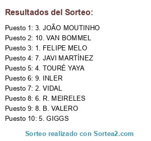 Lista de participantes: 1. FELIPE MELO, 2. VIDAL, 3. JOÃO MOUTINHO, 4. TOURÉ YAYA, 5. GIGGS, 6. R. MEIRELES, 7. JAVI MARTÍNEZ, 8. B. VALERO, 9. INLER, 10. VAN BOMMEL.