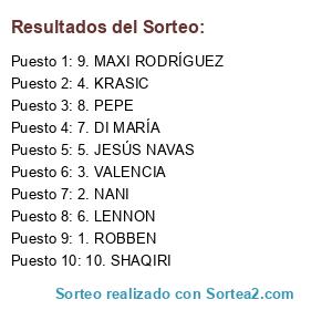 Lista de participantes: 1. ROBBEN, 2. NANI, 3. VALENCIA, 4. KRASIC, 5. JESÚS NAVAS, 6. LENNON, 7. DI MARÍA, 8. PEPE, 9. MAXI RODRÍGUEZ, 10. SHAQIRI.