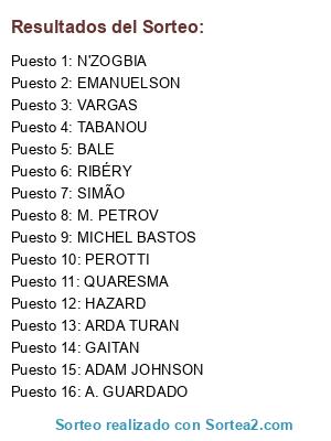Lista de participantes: RIBÉRY, HAZARD, BALE, VARGAS, GAITAN, MICHEL BASTOS, N'ZOGBIA, EMANUELSON, QUARESMA, ADAM JOHNSON, A. GUARDADO, ARDA TURAN, TABANOU, M. PETROV, PEROTTI, SIMÃO, .