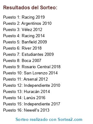 Lista de participantes: River 2018 , Boca 2007 , Independiente 2010 , Racing 2019 , Racing 2014 , Independiente 2017 , Vélez 2012 , Arsenal 2012 , Argentinos 2010 , Huracán 2014 , Newell's 2013 , Lanús 2016 , Banfield 2009 , Estudiantes 2009 , Rosario Central 2018 , San Lorenzo 2014.