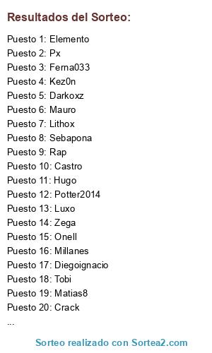 Lista de participantes: Px, Kez0n, Elemento, Llerar, Diegoignacio, Matias8, Rap, Onell, Sebapona, Ferna033, Millanes, Darkoxz, Hugo, Quicksilver, Crack, Zega, Lithox, Franco, Jarellano, Mauro, Castro, Potter2014, Tobi, Luxo.