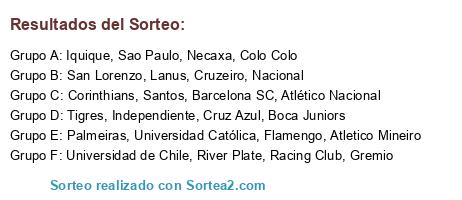 Lista de participantes: Racing Club, River Plate, Boca Juniors, San Lorenzo, Independiente, Lanus, Corinthians, Flamengo, Palmeiras, Cruzeiro, Santos, Atletico Mineiro, Gremio, Sao Paulo, Nacional, Barcelona SC, Atlético Nacional, Cruz Azul, Necaxa, Tigres, Universidad de Chile, Colo Colo, Universidad Católica, Iquique.