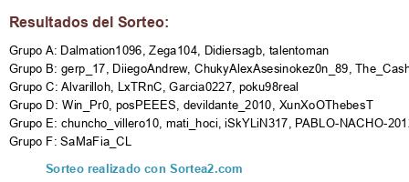 Lista de participantes: Garcia0227, PABLO-NACHO-2012, SaMaFia_CL, Zega104, talentoman, Dalmation1096, Alvarilloh, mati_hoci, Didiersagb, devildante_2010, iSkYLiN317, XunXoOThebesT, chuncho_villero10, gerp_17, posPEEES, Win_Pr0, ChukyAlexAsesinokez0n_89, poku98real, The_Cashu, DiiegoAndrew, LxTRnC.