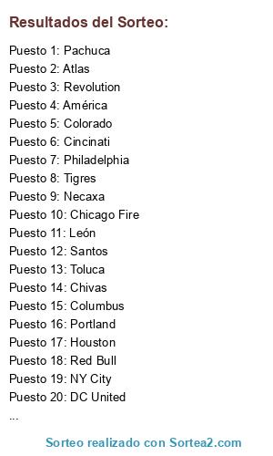 Lista de participantes: Toronto, Toluca, Tigres, Seattle, Santos, Revolution, Red Bull, Pumas, Portland, Philadelphia, Pachuca, NY City, Necaxa, Morelia, León, Los Angeles, Kansas, Houston, Galaxy, Earthqueakes, DC United, Dallas, Columbus, Colorado, Cincinati, Chivas, Chicago Fire, Atlas, Atlanta, América.