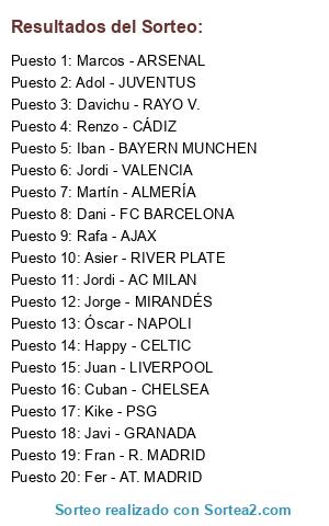 Lista de participantes: Jordi - AC MILAN, Rafa - AJAX, Martín - ALMERÍA, Marcos - ARSENAL, Fer - AT. MADRID, Iban - BAYERN MUNCHEN, Happy - CELTIC, Cuban - CHELSEA, Renzo - CÁDIZ, Dani - FC BARCELONA, Javi - GRANADA, Adol - JUVENTUS, Juan - LIVERPOOL, Jorge - MIRANDÉS, Óscar - NAPOLI, Kike - PSG, Fran - R. MADRID, Davichu - RAYO V., Asier - RIVER PLATE, Jordi - VALENCIA.