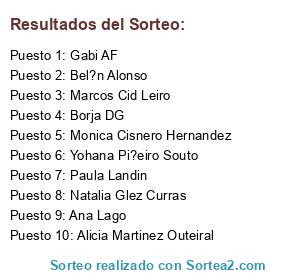 Lista de participantes: Dany Katiuskas, Alba Perez Otero, Angela Fontan Sanmartin, Silvia P. Pi?eiro, Nando Pan, Maria Aguete, Nuria Iglesias, Montserrat Franco Perez, Enrique Lage Mora?a, Fini Rodr?guez Ferre?o, Otero Duran Conchi, Erica JC, Merchy Quinteiro Garc?a, Ro P. Pi?eiro, Perfe Salgado Rodriguez, Patricia Suarez Veiga, Noli Quinteiro, Antonia Corbacho, Lucia Alende Ferreiro, Montse Moreno, Elena Romero, Bel?n Alonso, Isa Otero Abad, Yasmina Troncoso, Angeles Pereira, Yohana Pi?eiro Souto, Marcos Otero Otero, Ana Bel?n Martinez, Silvana Portela, Inma Mora?a, Cris Peleteiro Ruzo, Deby Estevez, Veronica Lopez de Castro, Jose Luis Aldao, Jose Carlos Cabeceiro Castro, Vanesa Ferrer Galban, Rosa PFez, Nuria Meis, Alicia Martinez Outeiral, Rafa Merino, Teresa Benavides Arias, Ana Mar?a Castro, Ana Lago, Loly Villa Pe?a, Aurora Migu?ns, Sara Abilleira Crespo, Marcos Cid Leiro, Vero Rodriguez, Gabi AF, Sara C. Guill?n, Miryam Boullosa Magari?os, Noem? Quintas Rodr?guez, Tere Gonzalez Gomez, Susana Pazos Novo, Richi Pi?eiro, Criss Amoedo Mendez, Lorena TG, Marta Lopes Ferreira, Ana Lorenzo Dios, Jose Fernandes, Blanca S?nchez Dios, Beatriz Estevez Villaverde, Borja DG, Estela Fontesfonti?as, Lourdes Maria Peon Casalderrey, Paula Landin, Rita Casalderrey Tores, Oscar Arosa Lorenzo, Josefina Palmieri, Monica Cisnero Hernandez, Paula Pazos, Lorena Soneira Villar, Carla Beloso, Vane Ber, Noemi Poceiro Argibay, Rouss Caeiro Pais, Jose Antonio Hermida Castro, Marisa Sousa Perez, Pili Crespo, Luc?a Re, Joseline Genesis Aguilar Paladines, Esther Alvarez, Lorena Abreu, Pilar Lamas Salceda, Susana Rey, Rosa Mar?a Blanco Nogueira, Mariana Pereira, Victor Souto Lusqui?os, Alejandra Garrido, Patricia Aboal Fernandez, Daniel Ferrad?s Villaverde, Andrea Mandado, Miguel Alonso Lorenzo, Mar?a Fari?a Cervi?o, Roxana Nanin, Alba Sobral Santiago, Marisol Garc?a Esper?n, Francisco Mu?iz, Ana Bela Cambados, Nadia Golly, Carmen Gandara, Cinco Estrellas, Cris Silva, Maria Silva Martinez, Natalia Glez Curras, Vanesa Oeo Piay, Ana Esteban, To?i Vazquez, Pilar Montes Paz?, ?ngela Chantrero Poceiro, Tania Rodr?guez Mart?nez, Lorena Varela, Beatriz Garcia, Aia Moreira Barreiro, Jos? Antonio Puente, Mar?a Mariscal, Ariadna Mendez, Jose Manuel Gonzalez Casalderrey, Mar?a Jos? Pita, Chus Casal, Xabi Black Rebel.