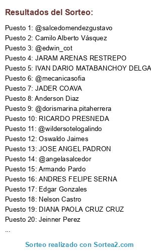 Lista de participantes: ADREY TATIANA CRUZ, ADRIAN AGUIRRE TREJOS, ADRIAN TIMAR, ADRIANA ALVAREZ, Albeiro Calderon, Albenis Leon, Alejandro Diaz, Alejandro Girardot, Alejandro Quevedo, Alejandro Rojas, ALEJANDRO VALDERRAMA, ALEX SUAZA FALLA, ALEXANDER RODRIGUEZ, Alexis Castillo, Alfonzo Mazo, Alirio Idarraga, ALONSO CASTILLO DUARTE, ALVARO RAFAEL PEÑA, Anderson Diaz, Andrea Hernandez, ANDREA PALADINES, ANDRES DAVILA, ANDRES FELIPE PULGARIN, ANDRES FELIPE SERNA, ANDRES MAURICIO VELAZQUEZ, ANDRES MURILLO, Andrés Ramirez, ANDRES ZAPATA, ANDRESBELTH SALCEDO, ANDRESON CASTRO, ANGEL GERMAN RODRIGUEZ, ANGELICA MARIA CARREÑO, Angie Gelves, Armando Pardo, Avelardo Castillo, Bladimir Londoño Herrera, BRANDON ALEXANDER SUAZA, BRANDON LUJAN OSSA, BRAYAN DAHIAM PINTO, Brian Valero, Camilo Alberto Vásquez, Camilo Loaiza, Carlos Acevedo, CARLOS ALBERTO SARMIENTO, Carlos Anaya, CARLOS ANDRES CESPEDEZ, CARLOS ANDRES SANCHEZ, CARLOS DIAZ, Carlos Leal, CARLOS MARIO GALVIS, CARLOS MARIO ZAPATA, Carlos Mora, Carlos Muñoz, Carlos Ruiz, CESAR AGUSTO GUTIRREZ, CESAR AUGUSTO JIMENEZ, CESAR MURILLO, Cesar Payan, CLARA RAMIREZ, CLAUDIA MILENA AYALA, CRISTIAN ANDREY GONZALEZ, Cristian Castillo, Cristian Fajardo, CRISTIAN FERNANDO QUINTERO, DAGNABER ORTEGA, Daniel Flores, DANIEL ROJAS, Daniel Vieira, Danilo Lopez, David Arango, David Rodríguez Sánchez, David Sebastián Córdoba Portilla, DIANA PAOLA CRUZ CRUZ, DIEGO FERNANDO BONILLA, DIEGO GOMEZ, Diego Lopera, DIEGO SASTOQUE, Dixon Ruiz, DOIMA BANCO, DUBER ANDRES VALENCIA, DUMAR MOLANO, Duvan Carvajal, Edgar Gonzales, EDILBERTO TORRES, EDWIN PABON CHARRY, ELKIN MAURICIO MERCHAN, Elkin Uran, ELVIS ALEXIS FONSECA, Elvis Niebles, Enrique Pulido, EVERRARDO CIFUENTES, FABIAN CASTRO CHAVARRO, FABIO LEONARDO PATIÑO, FAISAN SANCHEZ, Felipe Bedoya Gómez, FELIPE URIBE HERRERA, FERNANDO ANTONIO GALEANO, Fernando Camacho, FERNANDO QUIÑONEZ, FRANCISCO ESCOBAR, Freddy Maya, FREDY BLANDON SANCHEZ, Freysman Lopera, GENTIL PASTRANA VALENCIA, GERMAN PARADA, GILBERTO PERDOMO AROCA, GUILLERMO LEGUIZAMON, Gustavo Romero, Héctor Barradas, Hector Socorro, HERCTOR ESCARPETA, HERMIDES GASCA NOMELIN, Hernan Romero, HOLMAN CAICEDO NUSTES, HUMBERTO LUNA MURILLO, IVAN ALONSO CASTILLO, IVAN DARIO BUSTOS, IVAN DARIO MATABANCHOY DELGADO, IVAN DAVID RAMIREZ GALVIZ, IVAN RODRIGO SANCHEZ, JADER COAVA, Jaime Abendaño, JAIR DIAZ ANZOLA, JAIRO ARTEAGA BASANTE, Jairo Martinez, JAIRO RUIZ DURAN, JARAM ARENAS RESTREPO, JAVIER STEVEN ARDITA CORREA, JAVIER DARIO CASTILLO, JAVIER DUEÑAS, JEFFERSON ANDRES DIAZ, Jeinner Perez, JEISON DAVID RINCON, JESUS ANDRES VALENCIA, JESUS HENRY CAICEDO, JESUS ROJAS, Jherson Ospina, JHERSON OSPINA, JHON FREDY AYA, JHON FREDY MURILLO, Jhon Giraldo, Jhon Jairo Ruíz JImenez, JHON JAVER BERMUDEZ, Jhon Lopera, Jhon Pinzon, JOAQUIN CASTRO, JOAQUIN EDUARDO MOGOLLON, JOHAN EDGARDO CASTILLO, JOHAN MAURICIO ARTUNDUAGA, Jonathan A. Sarrazola, JONATHAN CABANZO, Jorge Leonardo Picon, Jorge Marin, Jorge ragaza, JORGE RESTREPO, JOS MASMELA, JOSÉ ABAHONZA, JOSE ALEXANDER AMARISCUA, JOSE ANGEL PADRON, JOSE ARMANDO ABAHONZA, José Coronel, JOSE ELICEO GONZALEZ, Jose Hernandez, Jose Lebete, JOSE MANUEL CARDENAS, JOSE RICARDO ESCOBAR GIL, JUAN CAMILO PATIÑO, JUAN CARLOS CHAMORRO, JUAN CARLOS FERNANDEZ, JUAN CARLOS MELO, Juan David Franco, Juan David Urrego, JUAN EDUARDO TRUJILLO, Juan Esteban Cardona, JUAN FERNANDEZ, JUAN GABRIEL REYES LADINO, Juan Prieto, JUAN RAMIREZ RAMIREZ, JUAN SEBASTIAN MOSQUERA, JUAN SEBASTIÁN RECALDE, JULIAN JIMENEZ GONZALEZ, Keiber Alvarez, KEM GONZALES, KLEIMER DUARTE, LAURA MARIA GARZO, LAUREANO AGUILAR, Leonardo Fajardo, Leonardo Parra, LEONARDO RODRIGUEZ, Lina Marcela Reyes, LINA PAOLA PEREZ HOYOS, Luis Carlos Acevedo, Luis Carlos Pérez, LUIS DAVID MARTOS LOPERA, LUIS FERNANDO PINZON DIAZ, LUIS FRANCISCO CELI, Luis Ramirez, LUIS RAUL, LUIS VELAZQUEZ, MAIRA ALEJANDRA LARA, MANUEL MARQUEZ, MANUEL SANTOS CRUZ, MARIA ELCY GARCIA, MARIA PAULA SUAZA, MARIA SHIRLEY TORRES, Mauricio Castro, MAURICIO JARAMILLO, Mauricio Serna, MIGUEL ANGEL MERRON, MIGUEL ANGEL NAVAS, MIGUEL ANGEL SALAZAR, MIGUEL MENDEZ, Miguel Rodríguez, Moises Morin, NATHALY GUZMAN DIAZ, Neider Nuñez, Nelson Castro, NELSON VELAZQUEZ, NEOMAR CASTALLANO, NESTOR CAJAMARCA, NICOLAS CORREA CORREA, Nicolas Echavarria, NICOLAS MORALES, NIDIA MENDOZA, NOLBER CRUZ, ODIXIS GRINES LEIVA BRITO, OLGA LUCIA MONTOYA, OLGA LUCIA MORENO, Omar Alberto Cano, OMAR BLANCO PEREZ, Omar Cuartas, OMAR PEREZ, Oscar Hernandez, Oswaldo Jaimes, PABLO JOSE MONTAÑO, PEDRO BONILLA, Pedro Carvajal, Pedro Vargas, RENE QUICENO GIL, Reny Jesus, RICARDO CEDEÑO, RICARDO FABIO RAMIREZ, RICARDO PRESNEDA, RODRIGO CARDONA, Rodrigo Cisnero, Rodrigo Palacio, ROSA MORA CASTAÑEDA, SAMUEL FLORES, SAMUEL MAURICIO LIZARAZO, SANTIAGO BENJAMIN LUBRIMACK, Santiago Ruíz Jimenez, SEBASTIAN MOSQUERA, Sebastian Veléz, Sergio Velandia, Stiven Aguirre, Stiven Ordoñes, TEREZA PARRA, VICTOR HUGO PARDO, Victor Reyes, WALTHER PEÑA TRIANA, WILFREDO SERRANO, WILINTON ORTIZ FERNANDEZ, WILLIN OMM ZERPA, WILLINGTONG GONZALEZ, WILMAR ARLEY PALACIO RAMIREZ, WILMER PINILLA, Wilmer Rangel, YANIRA RUIZ, Yarthon Garcia, YEAD MORENO, Yeferson Andrés Cardona, YEISON CAMILO CRUZ, ZULMA GUZMAN, @mecanicasofia, @sandyg1996, @gladyslorenita, @kkevinsuarez, @jhonbasto, @335577_335577, @chioca2007, @ferneydiaz, @daviosm, @yarthom.g, @yesicaluengas, @patino_fercho, @crisglory, @george.e_77, @pcg79, @herrera_loris1202, @mototaller_, @juanchis_juanchis, @wildersotelogalindo, @angelda15, @gladys_lanegra21, @dorismarina.pitaherrera, @edwin_cot, @adriana.bg16, @leidy_johana_11, @leidy.davidvelasquez, @angela.soto.7921, @sebastianramirez7463, @gcp231, @mallerly37, @david_10_1, @jhonas_cabanzo, @andreita.leon.73, @gabrielsalcedoc, @angelasalcedor, @edwinmartinez635, @tavosalcedo, @lis_oro, @cecired, @salcedomendezgustavo, @tavio_jeremy_202, @mecanicasofia, @mecanicasofia, @mecanicasofia, @mecanicasofia, @mecanicasofia, @mecanicasofia, @mecanicasofia, @mecanicasofia