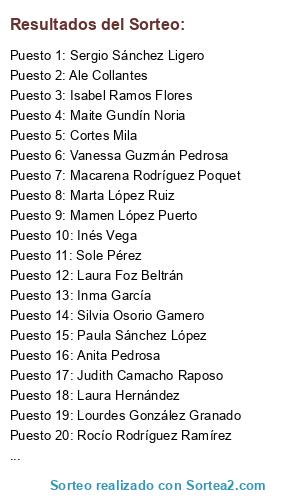 Lista de participantes: Vanessa Guzmán Pedrosa, Juanmi González Suárez, José María, Chari Figuereo, Daisa María Salguero, Rosario Montero Gutiérrez, Aroa López Rodríguez, Cristina Ramos Molina, Maite PM, Juan Acosta, Manuel Collantes Ramo, Ale Collantes, Mamen López Puerto, María Gallinato Fernández, José Manuel Acosta, Chari Ramírez, Lourdes González Granado, Viviana Morales Toro, Vanessa Morales Andrades, Mari Alba Macías, María Jesús RF, Mila Chacón Aragón, LadyWyrm Neko, Rocío Márquez, María Mixta Pantoja, Isabel Aragón Soriano, Lury Rus, Toñi Jerez, Fátima Morales Ortega, Inmaculada González Noriega, José Luis Casado Cruz, Cristina Khachaturian, Rocío Noria Serrano, Laura Coco, DavidyLur García Fornell, Dolores Diaz García, Marta Rubet, Rebeca Happyland, Mariana Domínguez García, Cristina Galleco Rivera, Manuel Pérez Herrera, Sergio Sánchez Ligero, Ángela Gala Pérez, María José Cazalla Oyola, Sandra Rodríguez Vías, Silvia González Ruiz, Ana García Montoya, Mercedes Mayone Torbaño, David Ortiz Torres, Cristina Ogalla, Olguita Cust, María José Moreno Suárez, H. Omer J Simpson, Chony López Arroyo, Isaac Ariza, virginia Espinosa De Los Monteros, Marisol Merino Buhigas, Olga Acosta Márquez, Juan Carlos Casti, Elena Alarcón, Ángela GaIRo, Carmen Silva Cano, Lorena Loreni, Manuel Pablo Romero, Jesús Salvador Cedillo Pineda, Laura Rey Peris, Rocío Baayer Díaz, Isabel González Gómez, Sole Pérez, Jose María Chico Toba, Daniel Arana Llovet, Encar Mo, Antonio Villena Mellado, May Kel, Raquel Rodríguez Galán, Esther Paez, María José Gallardo Molina, Yasmina Lara, Carmen Hidalgo Lubián, Mary García, Silvia Lobato Ríos, Nuría Femenía Navarrete, Rocío López-Cepero Pérez, Susana López Gwenbully, Mari Carmen Lozano, Carmen Arias Furet, Laura Foz Beltrán, José Luis Dávila García, David Luna Merino, Pepa Llinares, Ana Romero Florido, Patricia Cardamas Freire, Nela Cosano Rojas, Cristina Méndez Perles, Rocío Rodríguez Ramírez, Laura García, Miguel Ángel Guerrero Álava, Laura Hernández, Eva Guerrero Herrera, Inmaculada Atienza Acosta, Raquel Borga Morera, Valeria Miranda, Agustín Romero, Selene Posadas, Noemi GN, Gabri Crespo Sánchez, Neda Cábanas, Manuel Robles Álvarez, Ana Gama, Blas Fernández Segura, Rocío Cábanas, Noe Gutiérrez, Susana Urbina Domínguez, Loli Carrillo Crespo, Myriam Rubal Irún, Manuela Noble García, Lolo Lip, Rocío Ros, Carmen Alba García, Dolores Pérez González, Majose Gra Oj, Jorge Vilches, Catherine GR, Cristina Letrán Torres, Cati Hernández Iglesias, Cortes Mila, Soledad Bolullo Pérez, Meléndez Guerrero Ab, Dessi Mt, Dora ValenCab, Marta López Ruiz, Francisco Atienza Acosta, José María Chico Toba, Vanessa Macías Bazo, Georgiana Moroiu, Tamara Tita-madrina, Sarita Galvez Reyers, Penélope Mesa, Ana Abollado Alfaro, Mati Vargas Doello, Alba Fernández Blanco, Carmen Gaviño, Inmaculada Ortega Barba, Antonio Ruiz, Begoña Sánchez Ríos, Cira Marques Romero, Sonia Ruiz Rondán, Leonor Latrenzademipelo, Lorena Vélez Santos, Cristina Gilabert, Rosii Giraldez Moreno, Cecilia Cordero Marroquín, Macarena Rodríguez Poquet, Iván Narbona, Maite Gundín Noria, Cristina Núñez Padilla, JM Camacho, Isabel Fernández Segura, Beatriz Tur, Enkarni Ruiz, Bea Ferrer, Patricia Buller, Celia González Ruiz, Mariam Mateo, Lucía Jarana, Analeo Madueño Vera, Chio Sap, Judith Camacho Raposo, Carmela Carmelita, Isabel María Durán González, Sra De Martínez Ramírez, Eva María Menacho Domínguez, Teresa Oliva Fernández, Karen Closet, Andrés J. Villena Mellado, Sandra Carbonara Calderón, Eva López, María Victoria, Inma Márquez, Magnolia Gutierrez, Carmen Cordero Vázquez, Rafael Sánchez de Nieva, Anita Pedrosa, Mari Luz Márquez, Margarita Amarilla, Antonio Cortina Barranco, Inma García, María Cordero Pérez, Carolina García Bazo, Nikita Ni pongo, MariCarmen Guerrero Agüera, Raquel Sánchez, Lore Gutierrez, Juan José García Rivero, Ana Barrios, Milagros Triviño Sevilla, May Pacheco Naveiro, Natividad Bollullo Murillo, Marina Suárez, Nazaret Revidiego Benzo, Diego Casado, Isa Galisteo, Carmen De Alba Reyes, Tamara Montes De Oca, Roseblack Roseblack, Silvia Osorio Gamero, Maria Mixta Pantoja, Paola Guerrero, Paula Guzmán, Isabel Ramos Flores, Cristina Ramírez González, Andaluz de pura Cepa (Jesús Bazo Pino), Sandra Sastre Reina, Rocío Reyes Correa, Yolanda Quiñones Pérez, Ángeles Suano García, Jandro De la Vega, Marikilla Bernal Collantes, MiriSamuel Galloso Fernández, Anabel Torres, Con Jerez (Rocío García Domínguez), Isabel Alarcón, Lola Ríos Álvarez, Jesús Gil Berrocal, Elia Garrido Carrasco, Almudena Benítez Muñoz, Irene Pajarón López, Patry Fernández Pérez, Juan José Yuste Gudín, Irene Gallego Sánchez, Lucía Garzón Fernández, Anitta Villanueva, Alicia Rodríguez González, Carmen Masa Lora, Cely Benítez, Mercedes de la Flor, Eva de Jesús, Mira Vay, Irene Fernández, Teresa Masa Lora, Inés Castro, Anabel Moreno L, Nazaret Montes De Oca Bey, Cristina Núpez Padilla, Inés Vega, Virginia Suárez, Miguel Ángel Otero, Sarita Berciano Cuevas, Carla Villalba Fuentes, Paula Sánchez López, Susana Romero Sánchez, Belén Rodríguez Durán, Patri Cristo Pérez, Paula González(2 participaciones), Irene Moyano, Merchi Raposo, Marina Cruz Ossorio, Sandra González Aparicio, Ángela Yuste, Susana Pizarro, Alejandro Mateos, Sonia C Letrán, José Carlos Blanco Blanco, Bienvenida Ruiz Rodríguez, Eva Puente, Samuel Rodríguez Domínguez, Maria Fernández, Álvaro Bercazo.