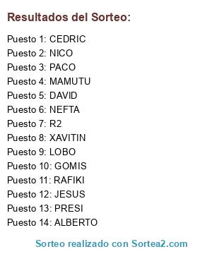 Lista de participantes: CEDRIC, NICO, PACO, MAMUTU, DAVID, NEFTA, R2, XAVITIN, LOBO, GOMIS, RAFIKI, JESUS, ALBERTO, PRESI.