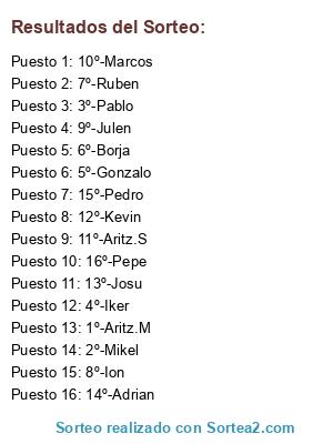 Lista de participantes: 1º-Aritz.M, 2º-Mikel, 3º-Pablo, 4º-Iker, 5º-Gonzalo, 6º-Borja, 7º-Ruben, 8º-Ion, 9º-Julen, 10º-Marcos, 11º-Aritz.S, 12º-Kevin, 13º-Josu, 14º-Adrian, 15º-Pedro, 16º-Pepe.