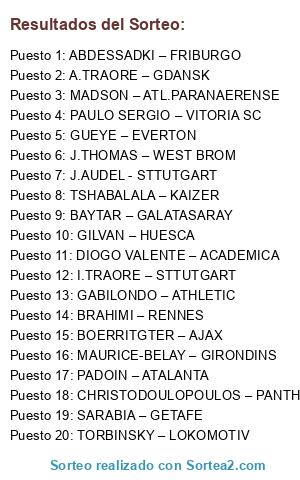 Lista de participantes: GILVAN – HUESCA, A.TRAORE – GDANSK, TSHABALALA – KAIZER, PAULO SERGIO – VITORIA SC, MADSON – ATL.PARANAERENSE, GUEYE – EVERTON, MAURICE-BELAY – GIRONDINS, ABDESSADKI – FRIBURGO, I.TRAORE – STTUTGART, BRAHIMI – RENNES, J.THOMAS – WEST BROM, CHRISTODOULOPOULOS – PANTHIN., TORBINSKY – LOKOMOTIV, BAYTAR – GALATASARAY, GABILONDO – ATHLETIC, BOERRITGTER – AJAX, DIOGO VALENTE – ACADEMICA, SARABIA – GETAFE, PADOIN – ATALANTA, J.AUDEL - STTUTGART.