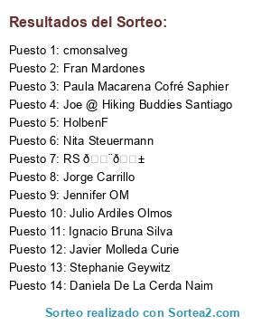 Lista de participantes: Rosalia Zegarra, Elias Ricardo, Felix Gerardo Cabrera, lalogrcm, Juan Barros, Juan Concha, meme, Julio Ardiles Olmos, Katalina Steinbrügge, HolbenF, RS 🇨🇱, Diego, Andrés Gardeweg, Miguel Andrés Becerra Cifuentes, Daniela De La Cerda Naim, Jennifer OM, Stephanie Geywitz, Alexander Beck Santibáñez, Joe @ Hiking Buddies Santiago, Ignacio Bruna Silva, Javier Molleda Curie, bicampeondeamerica, Tamy Cuevas 🏃🏻♀️, Jorge Carrillo, Paula Macarena Cofré Saphier, Tobias Merino, Victoria Pimentel, Nita Steuermann, Nicolás Ganter, Montserrat Rodríguez, Fran Mardones, cmonsalveg, jesusgoku.