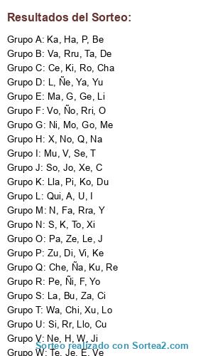 Lista de participantes: A, B, Ba, Be, Bi, Bo, Bu, C, Ca, Ce, Ci, Co, Cu, Ch, Cha, Cho, Che, Chi, Chu, D, Da, De, Di, Do, Du, E, F, Fa, Fe, Fi, Fo, Fu, G, Ga, Ge, Gi, Go, Gu, H, Ha, He, Hi, Ho, Hu, I, J, Ja, Je, Ji, Jo, Ju, K, Ka, Ke, Ki, Ko, Ku, L, La, Le, Li, Lo, Lu, Ll, Lla, Lle, Lli, Llo, Llu, M, Ma, Me, Mi, Mo, Mu, N, Na, Ne, Ni, No, Nu, Ñ, Ña, Ñe, Ñi, Ño, Ñu, O, P, Pa, Pe, Pi, Po, Pu, Q, Que, Qui, R, Ra, Re, Ri, Ro, Ru, Rr, Rra, Rre, Rri, Rro, Rru, S, Sa, Se, Si, So, Su, T, Ta, Te, Ti, To, Tu, U, V, Va, Ve, Vi, Vo, Vu, W, Wa, We, Wi, Wo, Wu, X, Xa, Xe, Xi, Xo, Xu, Y, Ya, Ye, Yi, Yo, Yu, Z, Za, Ze, Zi, Zo, Zu.