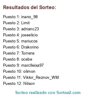 Lista de participantes: adrianc23, Nilson, Torrens, olimon, Limit, mariucos, inano_98, ocebe, joseelicio, marclleixa97, Viktor_Reznov_WM, Drakorino.