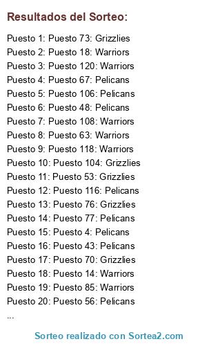 Lista de participantes: Puesto 1: Grizzlies, Puesto 2: Warriors, Puesto 3: Grizzlies, Puesto 4: Pelicans, Puesto 5: Warriors, Puesto 6: Pelicans, Puesto 7: Pelicans, Puesto 8: Warriors, Puesto 9: Warriors, Puesto 10: Grizzlies, Puesto 11: Warriors, Puesto 12: Warriors, Puesto 13: Grizzlies, Puesto 14: Warriors, Puesto 15: Pelicans, Puesto 16: Warriors, Puesto 17: Pelicans, Puesto 18: Warriors, Puesto 19: Warriors, Puesto 20: Grizzlies, Puesto 21: Warriors, Puesto 22: Pelicans, Puesto 23: Warriors, Puesto 24: Warriors, Puesto 25: Pelicans, Puesto 26: Grizzlies, Puesto 27: Grizzlies, Puesto 28: Warriors, Puesto 29: Grizzlies, Puesto 30: Pelicans, Puesto 31: Warriors, Puesto 32: Warriors, Puesto 33: Warriors, Puesto 34: Warriors, Puesto 35: Pelicans, Puesto 36: Grizzlies, Puesto 37: Pelicans, Puesto 38: Pelicans, Puesto 39: Warriors, Puesto 40: Grizzlies, Puesto 41: Warriors, Puesto 42: Warriors, Puesto 43: Pelicans, Puesto 44: Warriors, Puesto 45: Warriors, Puesto 46: Grizzlies, Puesto 47: Warriors, Puesto 48: Pelicans, Puesto 49: Warriors, Puesto 50: Pelicans, Puesto 51: Grizzlies, Puesto 52: Grizzlies, Puesto 53: Grizzlies, Puesto 54: Pelicans, Puesto 55: Grizzlies, Puesto 56: Pelicans, Puesto 57: Grizzlies, Puesto 58: Warriors, Puesto 59: Grizzlies, Puesto 60: Grizzlies, Puesto 61: Pelicans, Puesto 62: Warriors, Puesto 63: Warriors, Puesto 64: Warriors, Puesto 65: Warriors, Puesto 66: Pelicans, Puesto 67: Pelicans, Puesto 68: Warriors, Puesto 69: Warriors, Puesto 70: Grizzlies, Puesto 71: Grizzlies, Puesto 72: Warriors, Puesto 73: Grizzlies, Puesto 74: Pelicans, Puesto 75: Warriors, Puesto 76: Grizzlies, Puesto 77: Pelicans, Puesto 78: Warriors, Puesto 79: Grizzlies, Puesto 80: Warriors, Puesto 81: Warriors, Puesto 82: Warriors, Puesto 83: Warriors, Puesto 84: Pelicans, Puesto 85: Warriors, Puesto 86: Grizzlies, Puesto 87: Grizzlies, Puesto 88: Grizzlies, Puesto 89: Warriors, Puesto 90: Pelicans, Puesto 91: Warriors, Puesto 92: Warriors, Puesto 93: Pelicans, Puesto 94: Warriors, Puesto 95: Warriors, Puesto 96: Warriors, Puesto 97: Warriors, Puesto 98: Warriors, Puesto 99: Pelicans, Puesto 100: Warriors, Puesto 101: Warriors, Puesto 102: Warriors, Puesto 103: Grizzlies, Puesto 104: Grizzlies, Puesto 105: Warriors, Puesto 106: Pelicans, Puesto 107: Warriors, Puesto 108: Warriors, Puesto 109: Pelicans, Puesto 110: Warriors, Puesto 111: Warriors, Puesto 112: Pelicans, Puesto 113: Pelicans, Puesto 114: Warriors, Puesto 115: Pelicans, Puesto 116: Pelicans, Puesto 117: Grizzlies, Puesto 118: Warriors, Puesto 119: Warriors, Puesto 120: Warriors, Puesto 121: Grizzlies, Puesto 122: Grizzlies, Puesto 123: Grizzlies, Puesto 124: Grizzlies, Puesto 125: Warriors, Puesto 126: Grizzlies, Puesto 127: Warriors, Puesto 128: Warriors, Puesto 129: Grizzlies, Puesto 130: Warriors, Puesto 131: Grizzlies, Puesto 132: Warriors, Puesto 133: Warriors, Puesto 134: Warriors, Puesto 135: Warriors, Puesto 136: Grizzlies, Puesto 137: Warriors, Puesto 138: Pelicans, Puesto 139: Grizzlies, Puesto 140: Grizzlies.