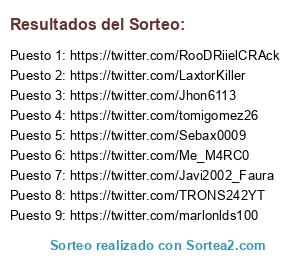 Lista de participantes: https://twitter.com/LaxtorKiller, https://twitter.com/Me_M4RC0, https://twitter.com/Javi2002_Faura, https://twitter.com/Sebax0009, https://twitter.com/tomigomez26, https://twitter.com/TRONS242YT, https://twitter.com/RooDRiielCRAck, https://twitter.com/Jhon6113(2 participaciones), https://twitter.com/marlonlds100.