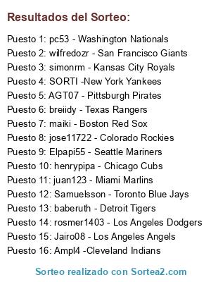 Lista de participantes: pc53 - Washington Nationals, SORTI -New York Yankees, Ampl4 -Cleveland Indians, juan123 - Miami Marlins, wilfredozr - San Francisco Giants, breiidy - Texas Rangers, Elpapi55 - Seattle Mariners, Samuelsson - Toronto Blue Jays, jose11722 - Colorado Rockies, maiki - Boston Red Sox, simonrm - Kansas City Royals, henrypipa - Chicago Cubs, AGT07 - Pittsburgh Pirates, Jairo08 - Los Angeles Angels, rosmer1403 - Los Angeles Dodgers, baberuth - Detroit Tigers.