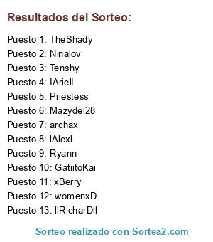 Lista de participantes: AlexCloud, archax, deslyon, esxeson, GatiitoKai, lAlexl, IArielI, lgrim, llRicharDll, llSorioNll, matador11, Mazydel28, NekuSakuraba, Ninalov, Pachu, Priestess, RedStorm, Ryann, Tenshy, TheShady, womenxD, xBerry.